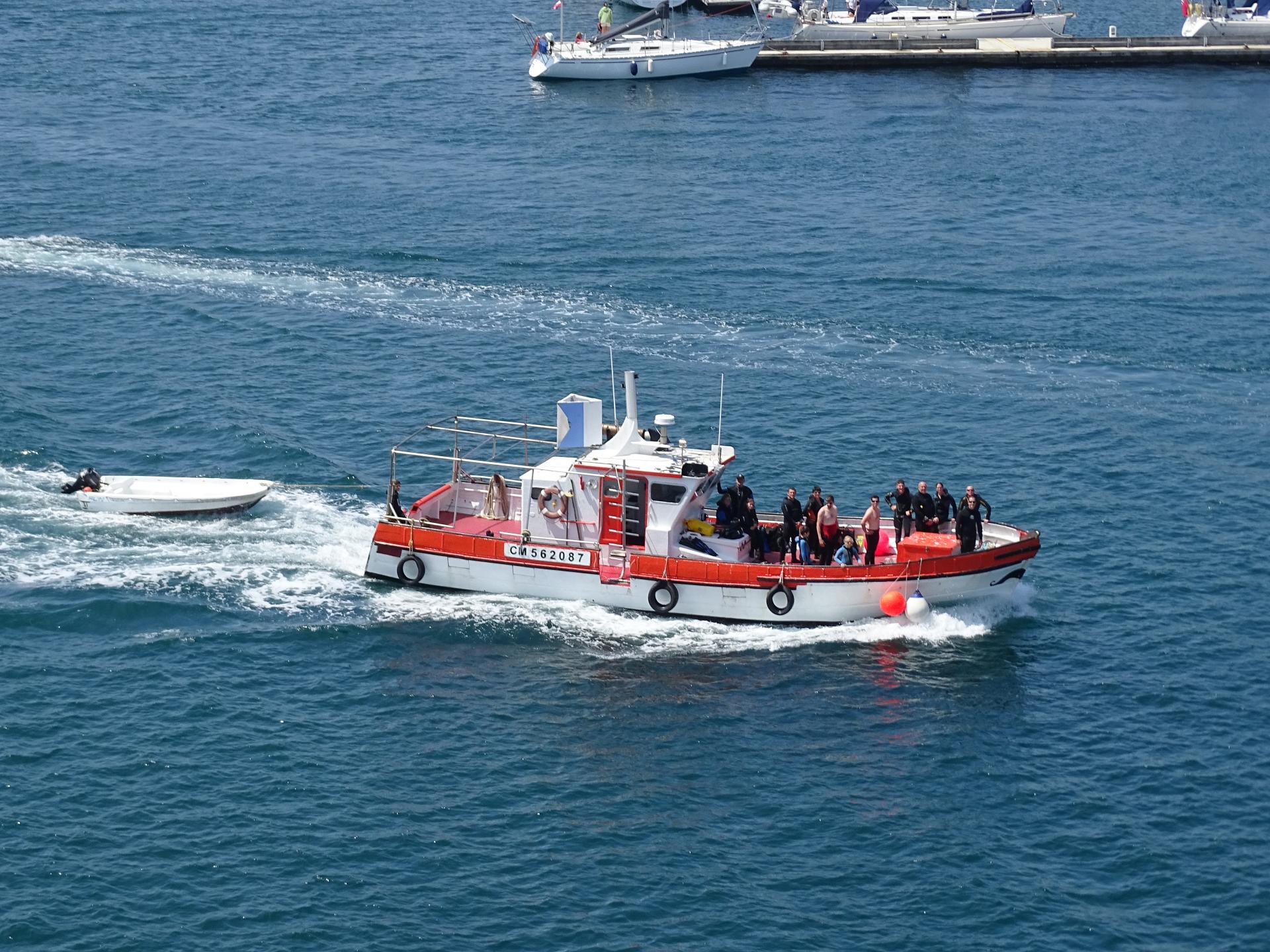 Le Club Léo Lagrange est une grosse structure multi-sports (Plongée, Voile, Planche à voile, Surf et Stand-Up paddle), dont le centre de plongée est situé sur le port de Camaret, un peu à l’écart des terrasses de restaurant. Il y a un grand local gonflage (gonflage air uniquement), un local de séchage bien ventilé avec de nombreux porte-manteaux pour faire sécher combinaisons et gilets, et des grands vestiaires. Mon seul regret est que les vestiaires soient mixtes, ce qui n’est pas hyper confortable pour un grand groupe comme le nôtre. Bref, l’installation est vraiment très fonctionnelle ! Une fois, équipé, on a juste à descendre sur le quai pour embarquer sur un des 2 bateaux du centre : le Japeto ou le Maraudeur. Notre groupe a pu bénéficier du confort du Japeto, qui peut embarquer jusqu’à 30 plongeurs, et qui malgré tout reste très spacieux.